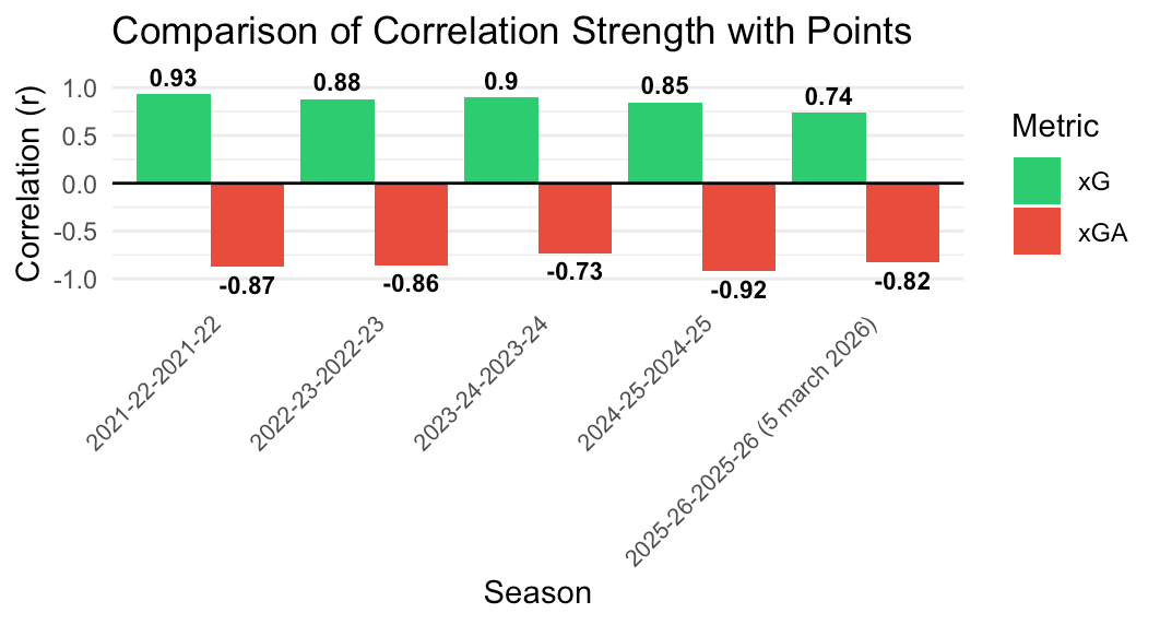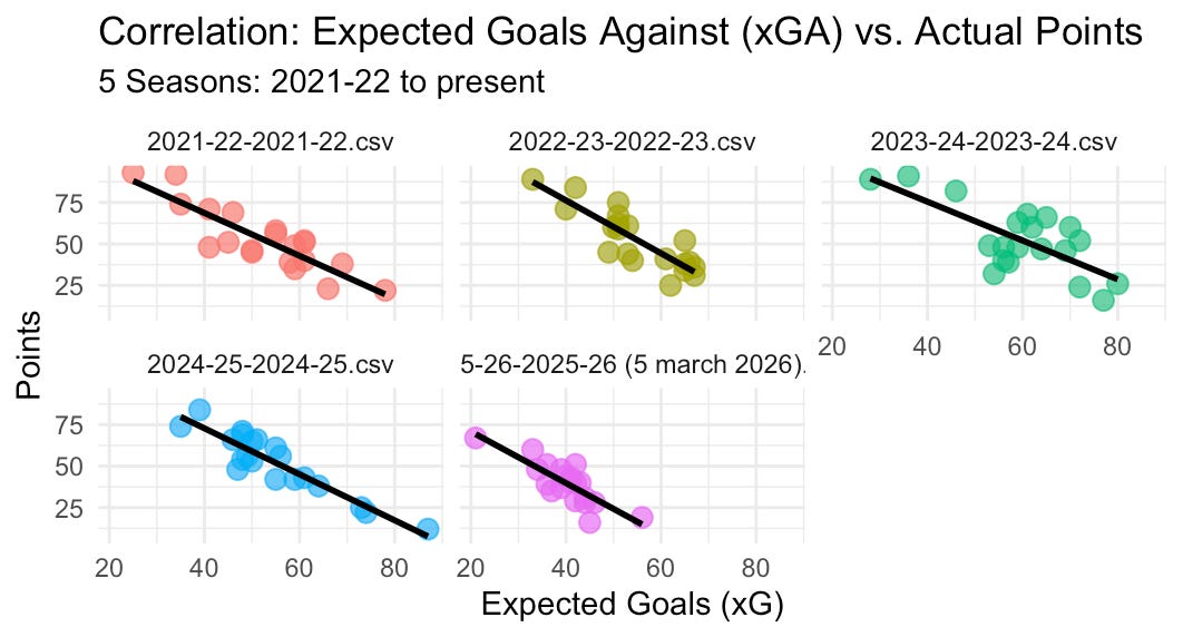 But here’s where it gets interesting, at least as I see it. In the graph below, I plotted the correlation of xG and points (green bars) for each of the last 5 seasons (including this one to date) alongside the inverse correlation of xGA to points. I’ve given you the correlation coefficients as the differences are extremely small (and a correlation coefficient of .7 or above typically indicates a strong correlation between two things). As you can see, in 2021-22, 2022-23, and 2023-24, creating a high xG correlated slightly more than giving up a low xGA with points. Last season and this season, however, it flips, and defending correlates slightly more with points: