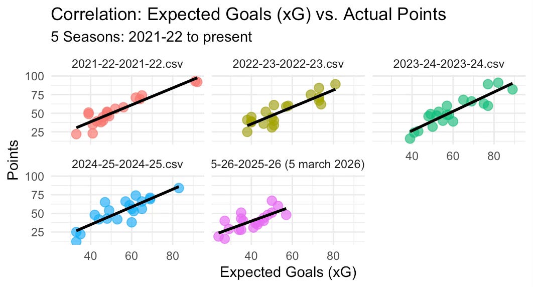 To put some substance to this claim, I looked into something relatively straightforward: Over the past 5 Premier League seasons (including this current season to date), how strong is the correlation between xG and points? As you can see here, it’s very strong!