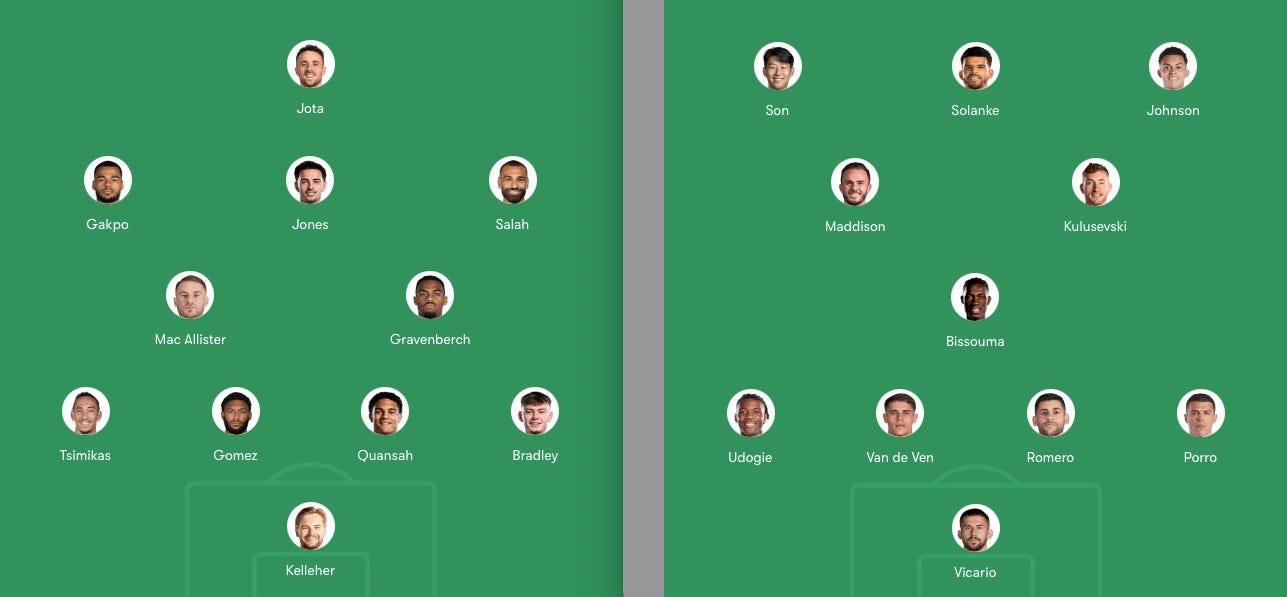 Just as a (charitable) visualization of what this would look like, and with the caveat that Liverpool of course have a stronger and much deeper squad than Spurs, this is roughly how each side would line up if the roles were flipped and it was depleted Liverpool against full-strength Spurs (with Liverpool missing Alisson, van Dijk, Konate, Robertson, Szoboszlai, Darwin, and one more of either Salah, Gakpo, Diaz, or Jota, and perhaps having Trent to bring on for Bradley, or shifting Bradley to the left side to play out of position):