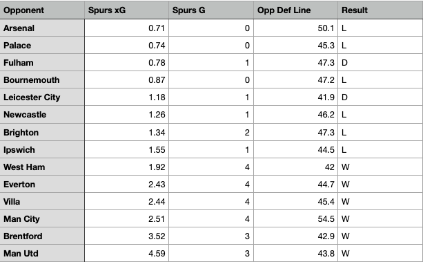 Focusing just on the Premier League now, beyond the 3 matches in which Spurs failed to score, Spurs only managed 1 goal in a further 4 matches: against Fulham (draw), Ipswich (loss), Leicester City (D), and Newcastle (loss). All in all, as you should expect, 6 of Spurs’ 7 lowest-scoring games were also the lowest-xG performances of the season. Recalling what I’ve watched in those 7 games, only against Ipswich (1.55 xG), Newcastle, and Leicester City do I think Spurs really ought to have scored more than 1 goal.